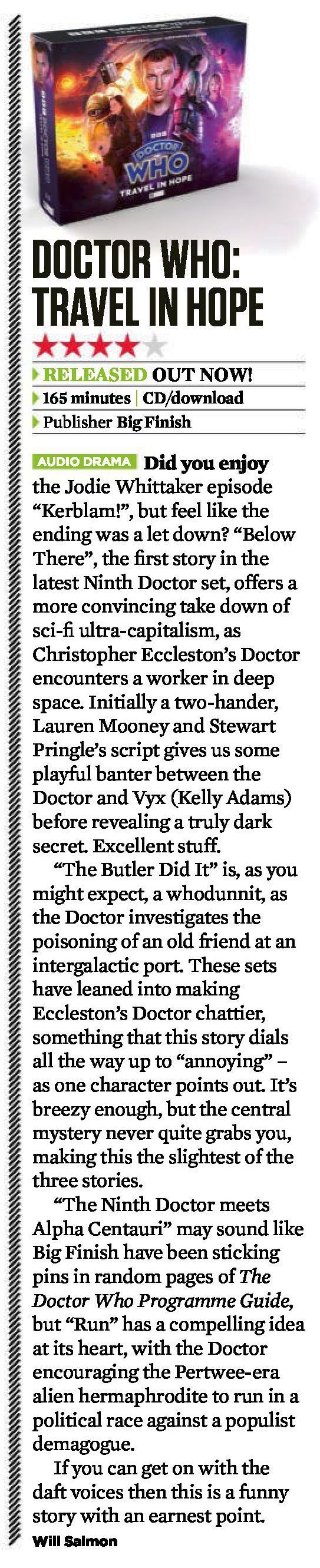• Turabian: Salmon, Will. "Doctor Who: Travel in Hope." SFX, issue 369 (September 2023), section, 111 edition.