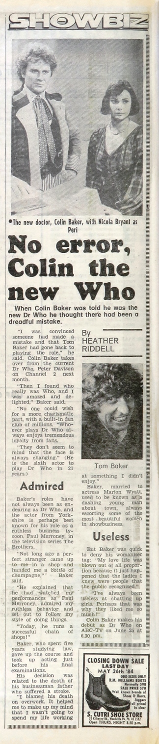 - APA 6th ed.: Riddell, Heather (1985-05-17). No error, Colin the new Who. The News (Adelaide) p. 44.