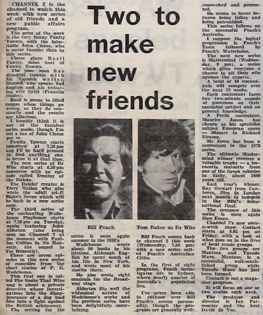 - Wikipedia (this article): <ref>{{cite news| title=Two to make new friends | url=http://cuttingsarchive.org/index.php/Two_to_make_new_friends | work=The Sunday Times (Western Australia) | pages=19 | date=1980-02-17 | via=Doctor Who Cuttings Archive | accessdate=5 December 2025 }}</ref>