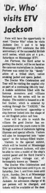 The Doctor Who Celebration and Tour will be held from noon until 8 p.m. on Saturday, Dec. 5, and from noon until 6 p.m., Sunday, Dec. 6, at Mississippi ETV, 3825 Ridgewood Road in Jackson. An admission charge of $5 per person will be charged, and tickets will be available at the door.